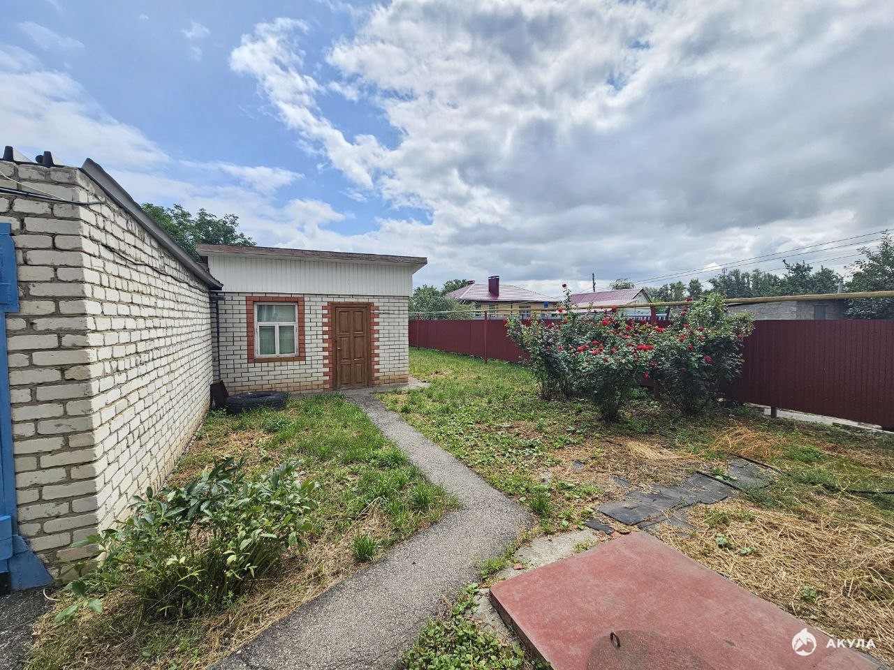 Из насаждений на участке имеются три яблони, персик, многолетние цветы.