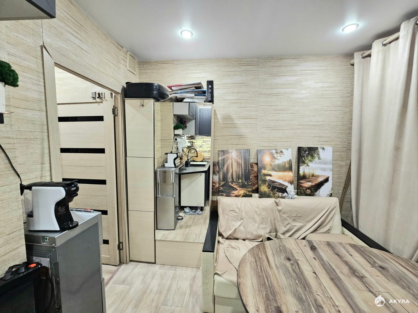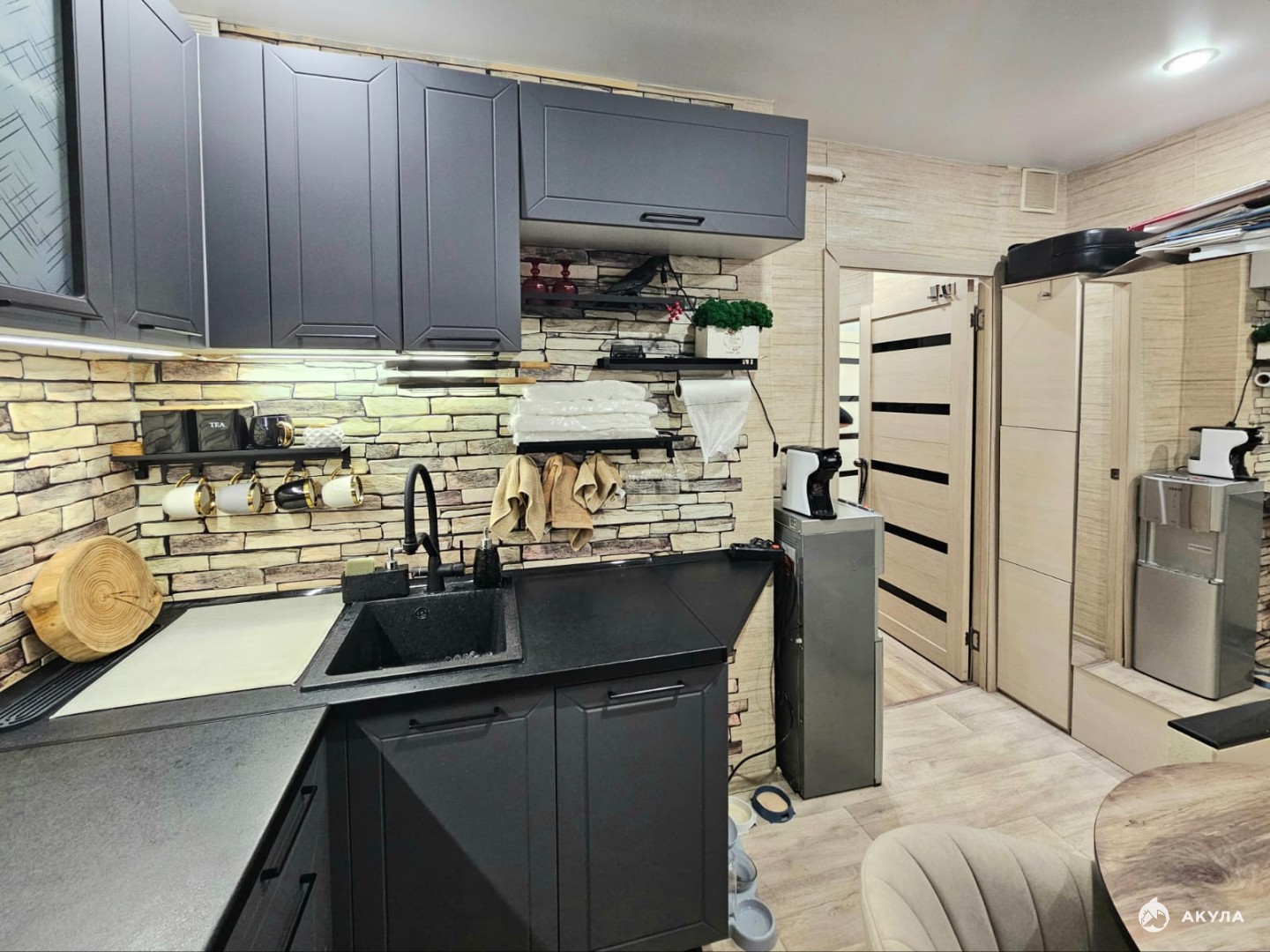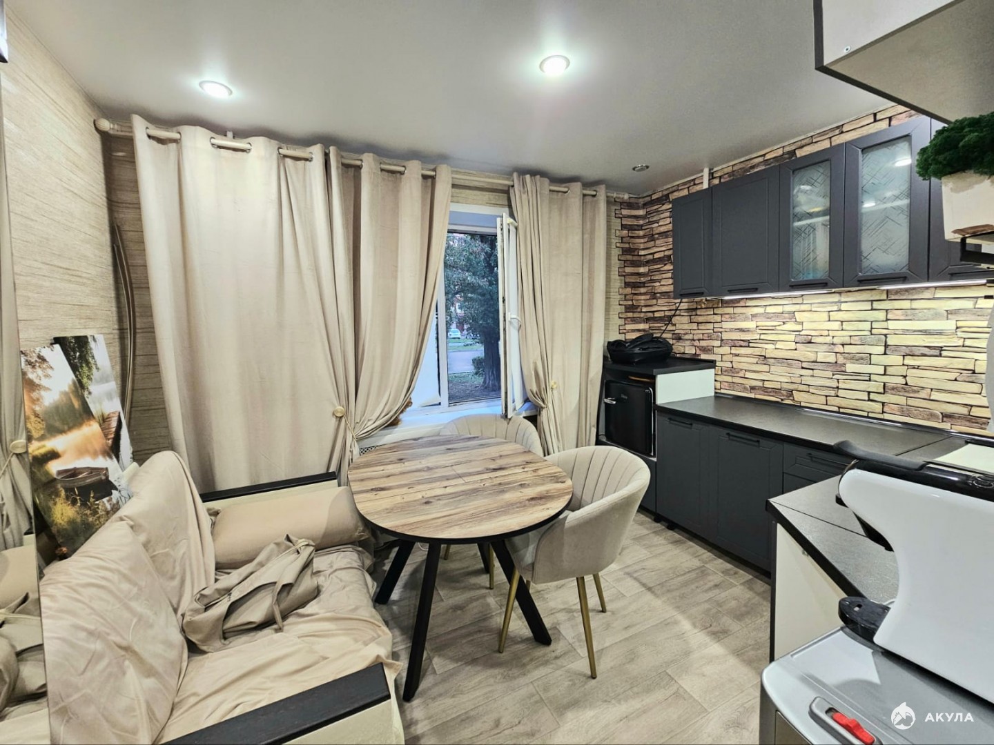 На момент продажи в квартире оставляют кухонный гарнитур, водонагреватель, кондиционер.
