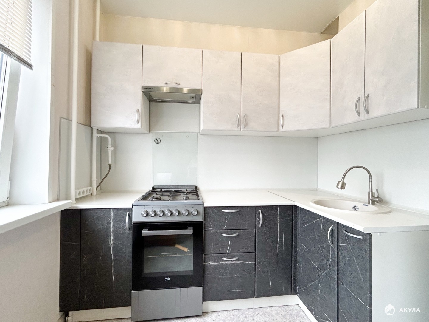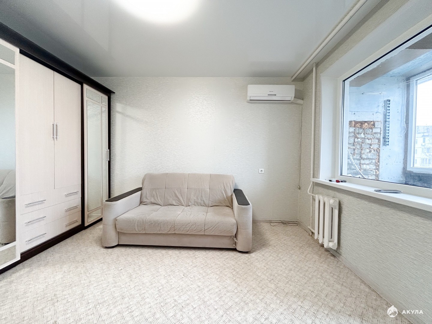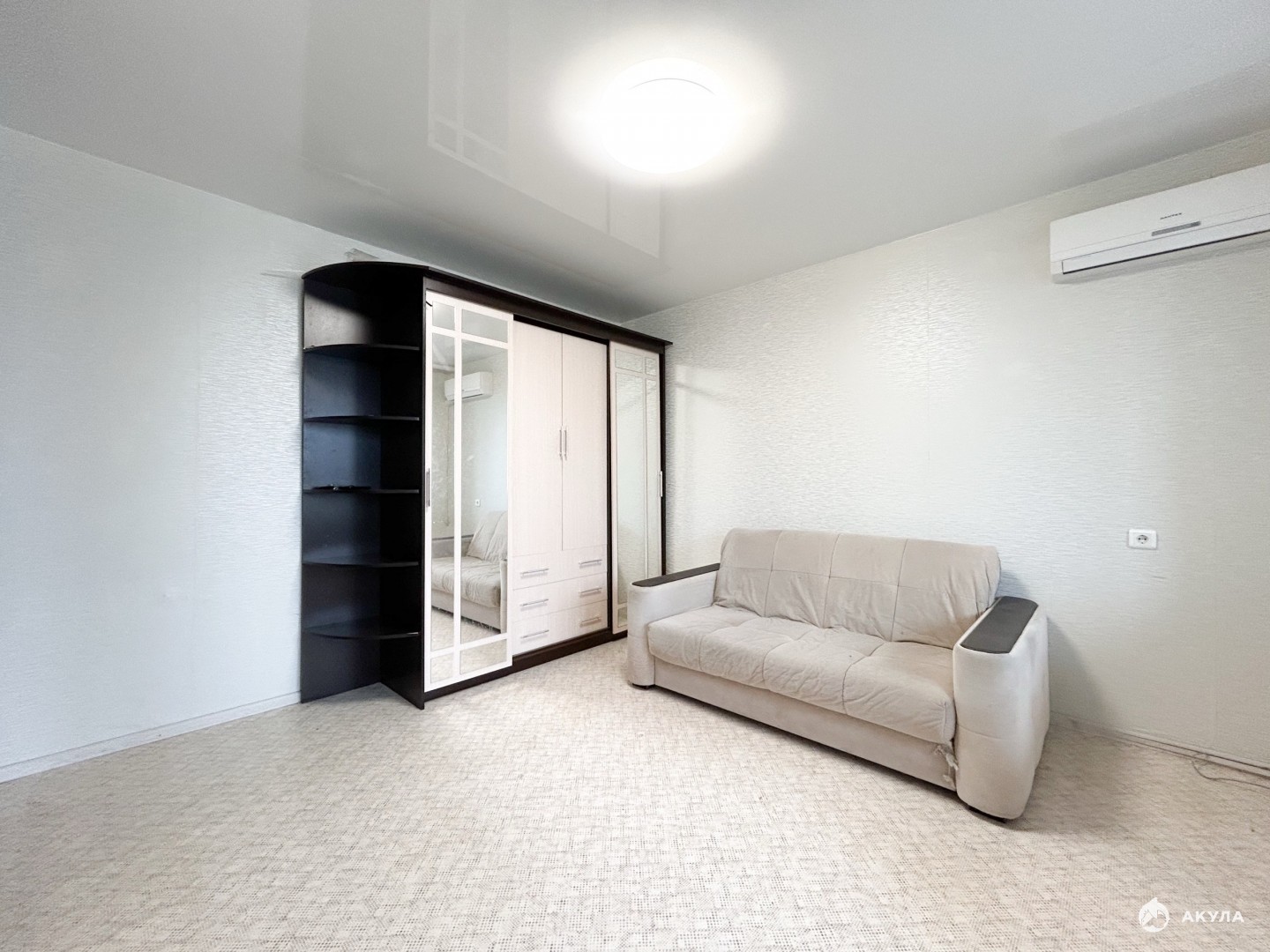 Остаётся мебель и техника: кухня, шкаф, диван, кондиционер, холодильник.