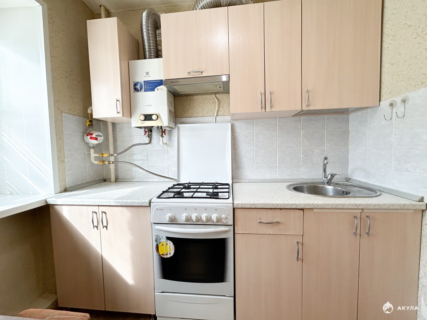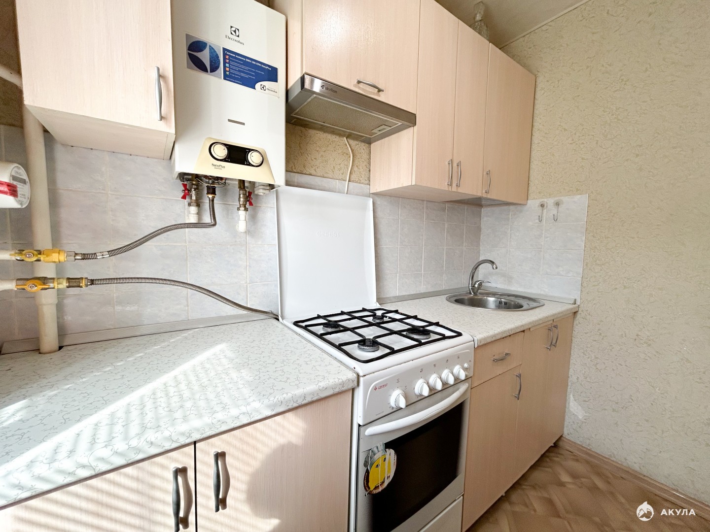 Санузел в плитке, газовая колонка горячая вода всегда.