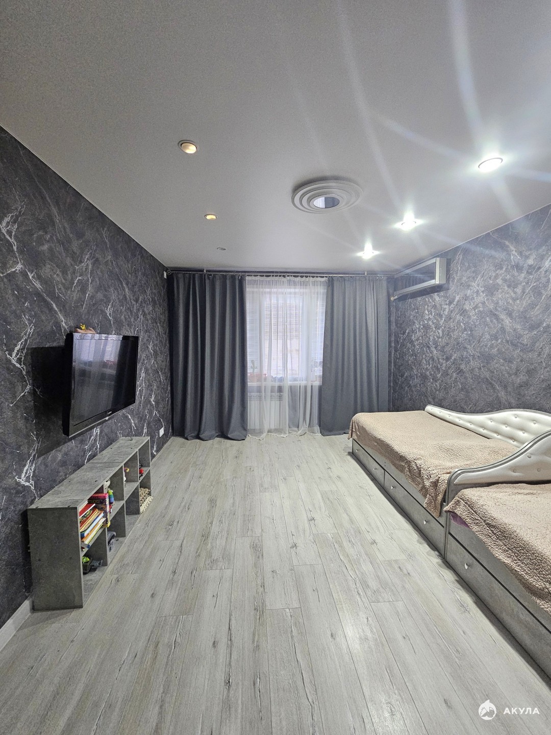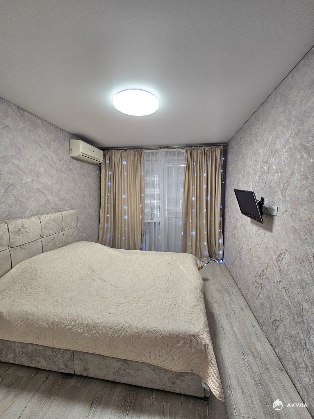 В квартире сделан ремонт, заменена электропроводка, выравнены стены и пол, на полу положен ламинат, поменяны все трубы, установлены новые счетчики, ванна в кафеле, туалет обшит пластиковыми панелями, везде натяжные потолки, окна пластиковые, лоджия застеклена пластиковыми окнами и обшита панелями, новые межкомнатные и входная двери.
